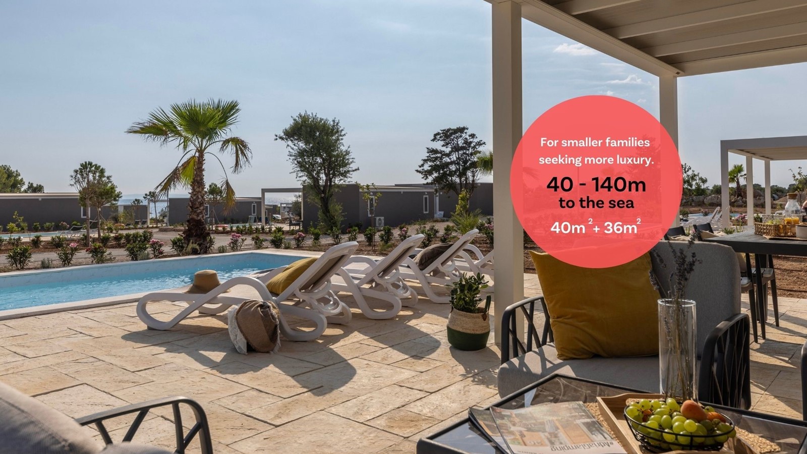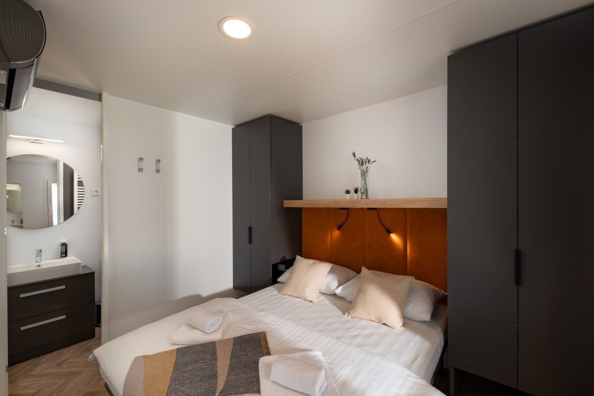 Concedetevi i piaceri di un soggiorno di lusso nelle più moderne case mobili, a 80 - 120 metri dal mare, con piscina privata riscaldata, solarium e spaziosa terrazza in pietra. La casa mobile è sufficiente per tutta la famiglia grazie ai suoi 70 m² interni.