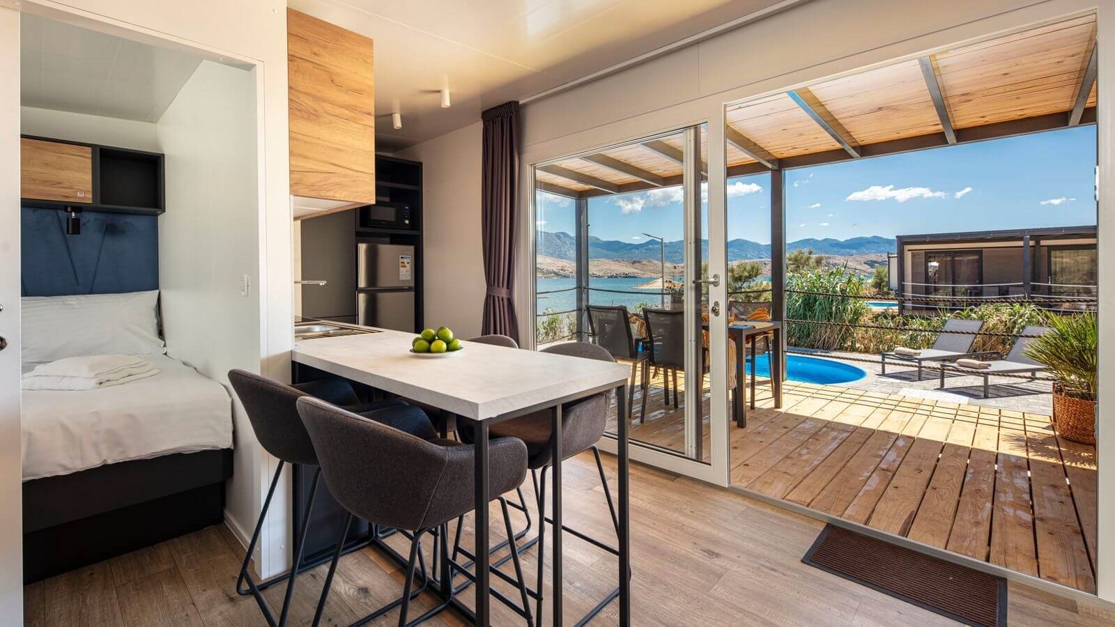 Mobilne kućice idealne za obitelji s dvoje djece koje žele uživati u čarima ljetovanja na Pagu. Opustite se u privatnom bazenu s pogledom na mjesečev otok i plavetnilo Jadranskog mora.